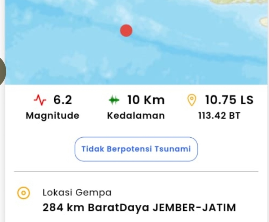 Seputarpublik, Jakarta – Badan Meteorologi, Klimatologi dan Geofisika (BMKG) melaporkan telah terjadi gempa magnitudo 6,2 berlokasi di 284 km Barat Daya Jember, Jawa Timur pada Selasa (6/12/2022) pukul 13.07 WIB dengan kedalaman gempa 10 kilometer.